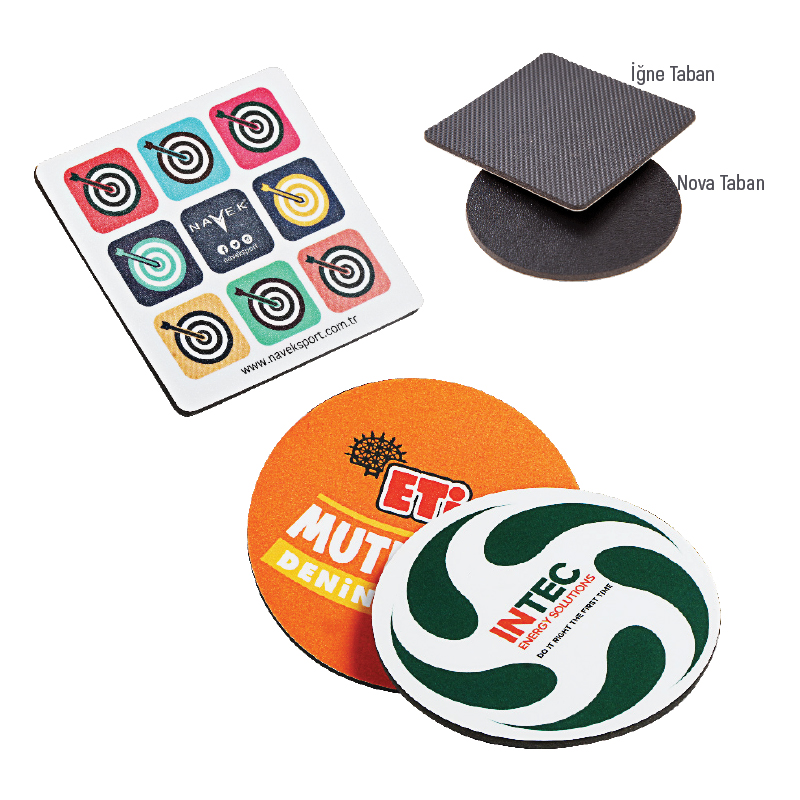 8,75 x 8,75 cm Kare veya 8,8 x 8,8 cm yuvarlak / 2.8 mm nova yada, 2.6 mm iğne desen taban / 4 renk baskı, PVC kaplama